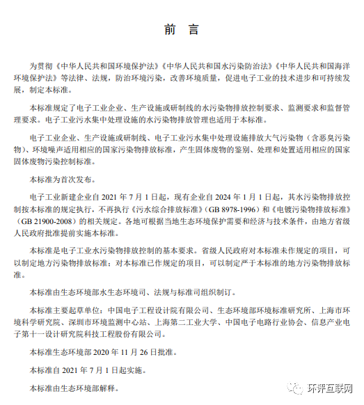 《電子工業水污染物排放標準》自2021年7月1日起實施。