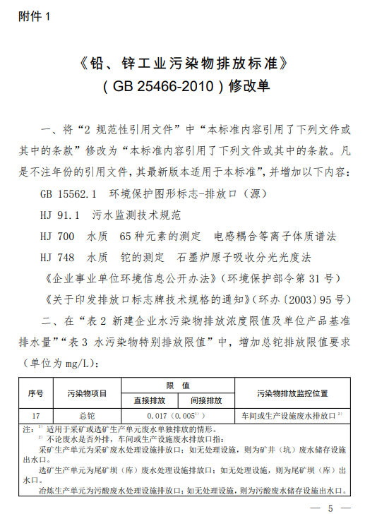 附件:1.《鉛、鋅工業污染物排放標準》(GB 25466-2010)修改單