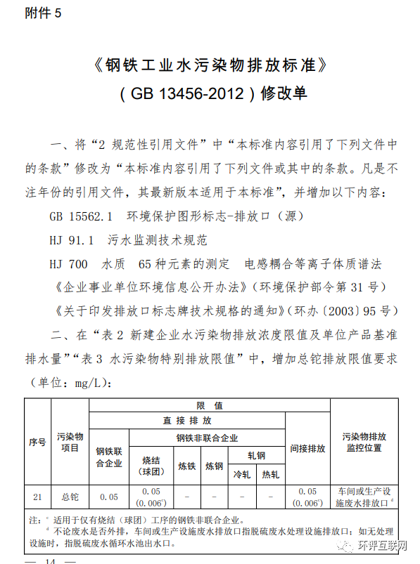 5.《鋼鐵工業水污染物排放標準》(GB 13456-2012)修改單