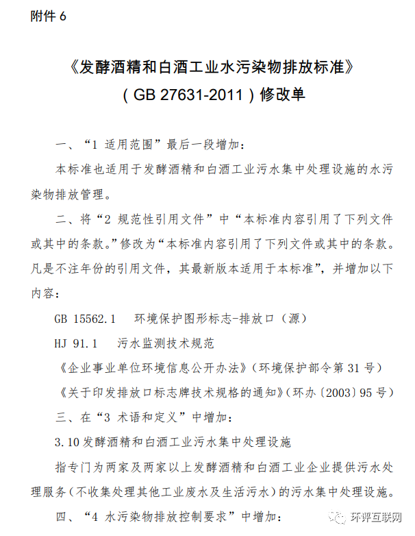 6.《發酵酒精和白酒工業水污染物排放標準》(GB 27631-2011)修改單