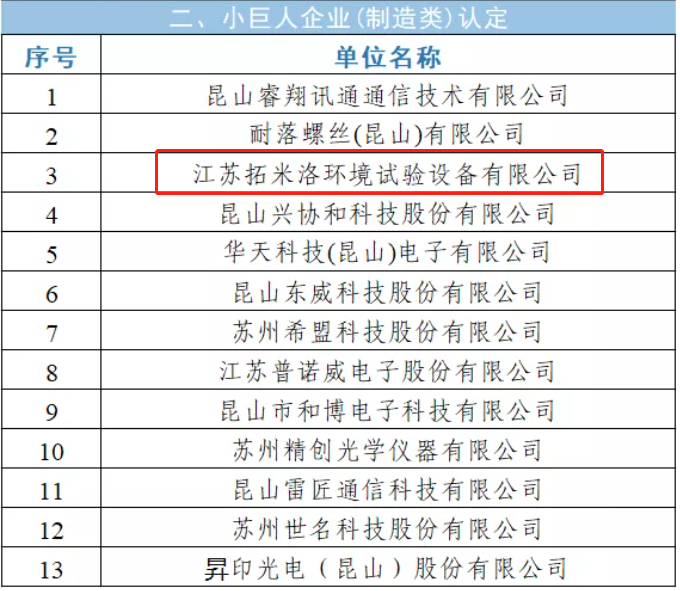 近日,江蘇省工信廳公布2021年度省專精特新小巨人擬認(rèn)定企業(yè)名單和復(fù)核擬通過企業(yè)名單,江蘇拓米洛環(huán)境試驗(yàn)設(shè)備有限公司獲得了小巨人企業(yè)(制造業(yè))的認(rèn)定。