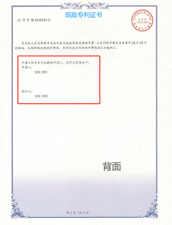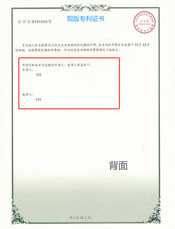 2.專利申請日時(shí)申請人、發(fā)明人信息,從證書背面來到證書正面。