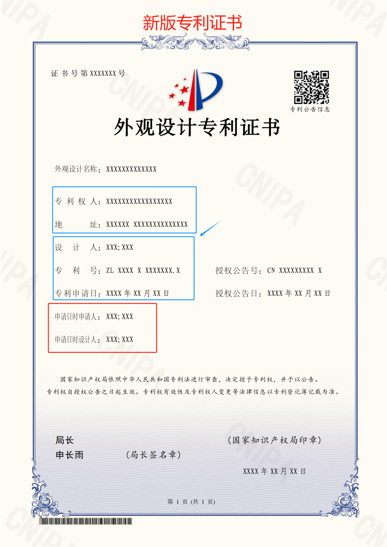 此外,實(shí)用新型專利證書和外觀設(shè)計(jì)專利證書也有相同變化。