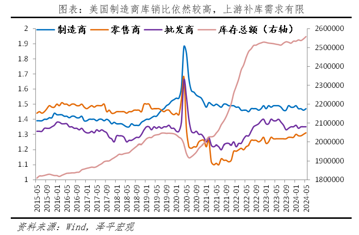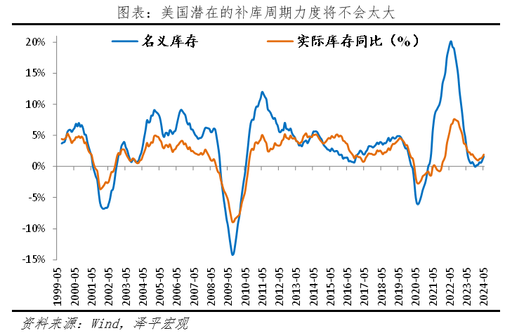 1)美國經(jīng)濟(jì)出現(xiàn)三點放緩信號,但著陸方式尚不確定。一是當(dāng)前美國家庭儲蓄率出現(xiàn)下滑,高水平的消費支出可能在長期內(nèi)難以持續(xù);二是長期高利率下,需求不足、新屋開工率下滑,拖累住宅投資和建筑投資。三是補庫周期較弱,從名義庫存的角度看,美國庫存去化較快。但高通脹導(dǎo)致以名義庫存視角判斷補庫力度(涵蓋工業(yè)品價格與工業(yè)品數(shù)量需求)在當(dāng)前指導(dǎo)意義較差。若從實際庫存來看,美國本輪去庫程度較為有限,本輪補庫強(qiáng)度可以參考2016年底的補庫周期,整體力度不會太大,更多的是行業(yè)層面的結(jié)構(gòu)性補庫。