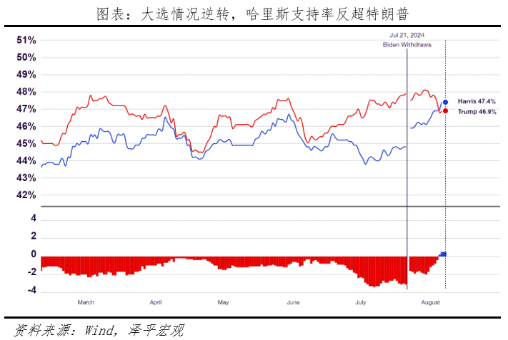 3)美國大選選情膠著,但候選人對華遏制態(tài)度不變。7月拜登退選,哈里斯迎來“政治蜜月期”,民調(diào)支持率反超特朗普,但選舉人票數(shù)仍落后于特朗普,選舉局勢不確定性較強(qiáng)。我們曾在《美國大選展望:特朗普會否重返白宮及影響》中設(shè)想兩種情景:一種是特朗普當(dāng)選,美國將通脹再起、利率維持高位,逆全球化,可能引起美國再通脹、提高關(guān)稅,惡化盟友關(guān)系。另一種情形是哈里斯當(dāng)選,主張團(tuán)結(jié)盟友、支持創(chuàng)新、上調(diào)最低工資、保護(hù)薪水福利、醫(yī)改、接受難民等,預(yù)計將聯(lián)合盟友向中國施壓。但對華政策方面,無論誰當(dāng)選預(yù)計都將保持遏制態(tài)度。