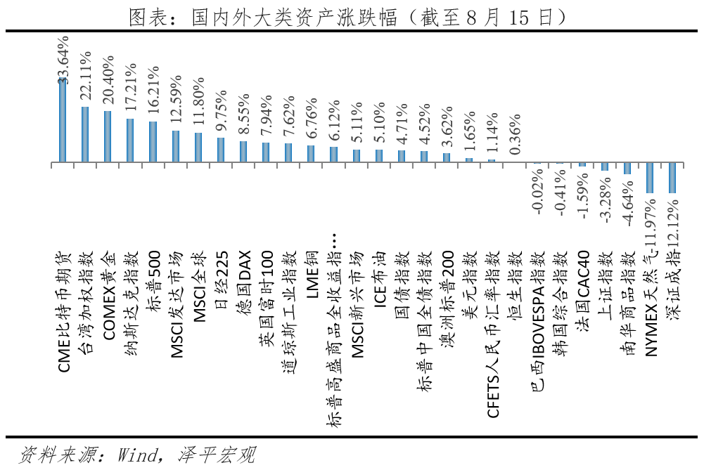 2024年初以來大類資產(chǎn)走勢分化,海外資產(chǎn)表現(xiàn)整體優(yōu)于國內(nèi)市場。海外市場權(quán)益市場領(lǐng)漲。2024年初至8月15日,WIND全球股票上漲12.70%,其中發(fā)達(dá)市場13.50%,新興市場5.95%,美歐漲幅靠前。標(biāo)普商品指數(shù)5.95%,其中貴金屬、能源、軟商品兩位數(shù)漲幅領(lǐng)漲。國內(nèi)市場,債市走牛、權(quán)益復(fù)蘇乏力。截至8月15日,上證指數(shù)-3.28%,WIND境內(nèi)債券上漲4.54%,人民幣匯率指數(shù)1.1394%,小幅走強(qiáng),南華商品指數(shù)-3.59%。上半年表現(xiàn)較好的資產(chǎn)有三類,一是以去美元化、避險屬性為主的比特幣和黃金;二是供給因素推動的原油,全球制造業(yè)復(fù)蘇邏輯的有色金屬類大宗品;三是價值風(fēng)格的日本股市、AI浪潮的美國科技股等。