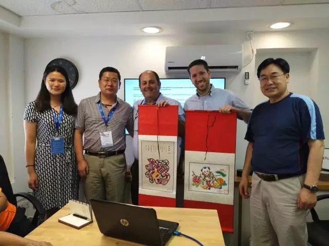 參觀交流結(jié)束后,考察團(tuán)班長(右一)中國文化辦公設(shè)備制造行業(yè)協(xié)會副理事長焦延和、副班長(左二)中國儀器儀表行業(yè)協(xié)會分析儀器分會秘書長曾偉向以方企業(yè)贈送具有中國特色的禮物
