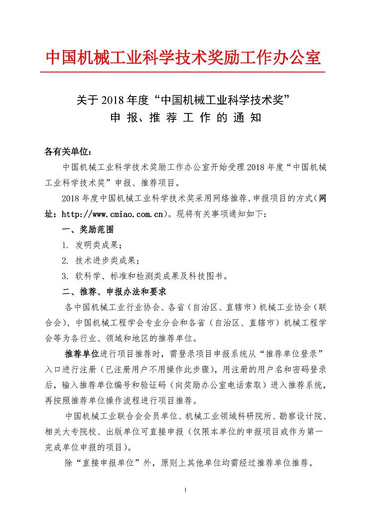 關于2018年度“中國機械工業科學技術獎”申報、推