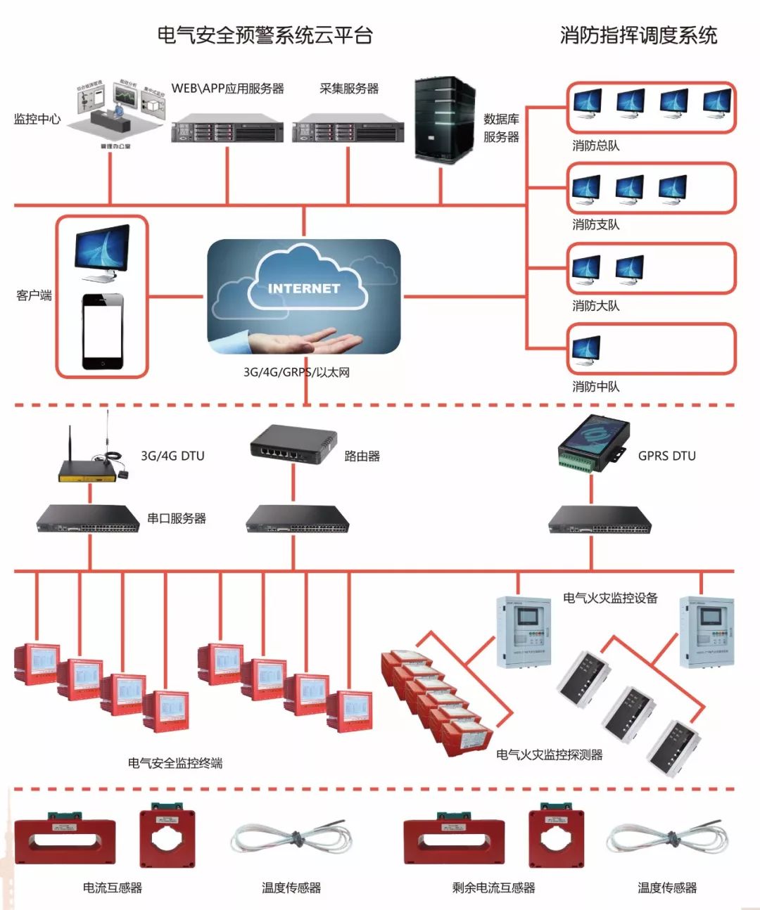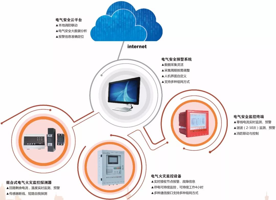 依靠電氣安全云平臺、電氣安全預警系統,監控終端、探測器等,將各監測點的電氣安全預警、治理數據實時傳送至系統平臺數據中心。