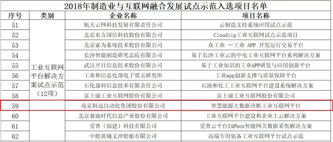 為推動基于互聯網的制造業技術、模式、業態等創新和應用示范,日前,國家工信部發布2018年制造業與互聯網融合發展試點示范項目名單,科遠股份智慧能源大數據診斷工業互聯網平臺作為工業互聯網平臺解決方案試點示范成功入選。