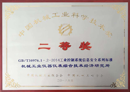 2018年11月,中國機械工業聯合會發布《關于表彰2018年度中國機械工業科學技術獎獎勵項目的通報》(中機聯科〔2018〕282號)文件,對416項榮獲中國機械工業科學技術獎的項目進行了表彰。機械工業儀器儀表綜合技術經濟研究所(以下簡稱“儀綜所”)組織制定的GB/T 30976.1~.2《工業控制系統信息安全》系列標準榮獲中國機械工業科學技術獎二等獎,獲獎單位包括儀綜所、北京東土科技股份有限公司和北京和利時系統工程有限公司,其中儀綜所獲獎人員為汪爍、王成城、李思遠、梅恪、王玉敏、施奇維、劉奕寧和張濤。