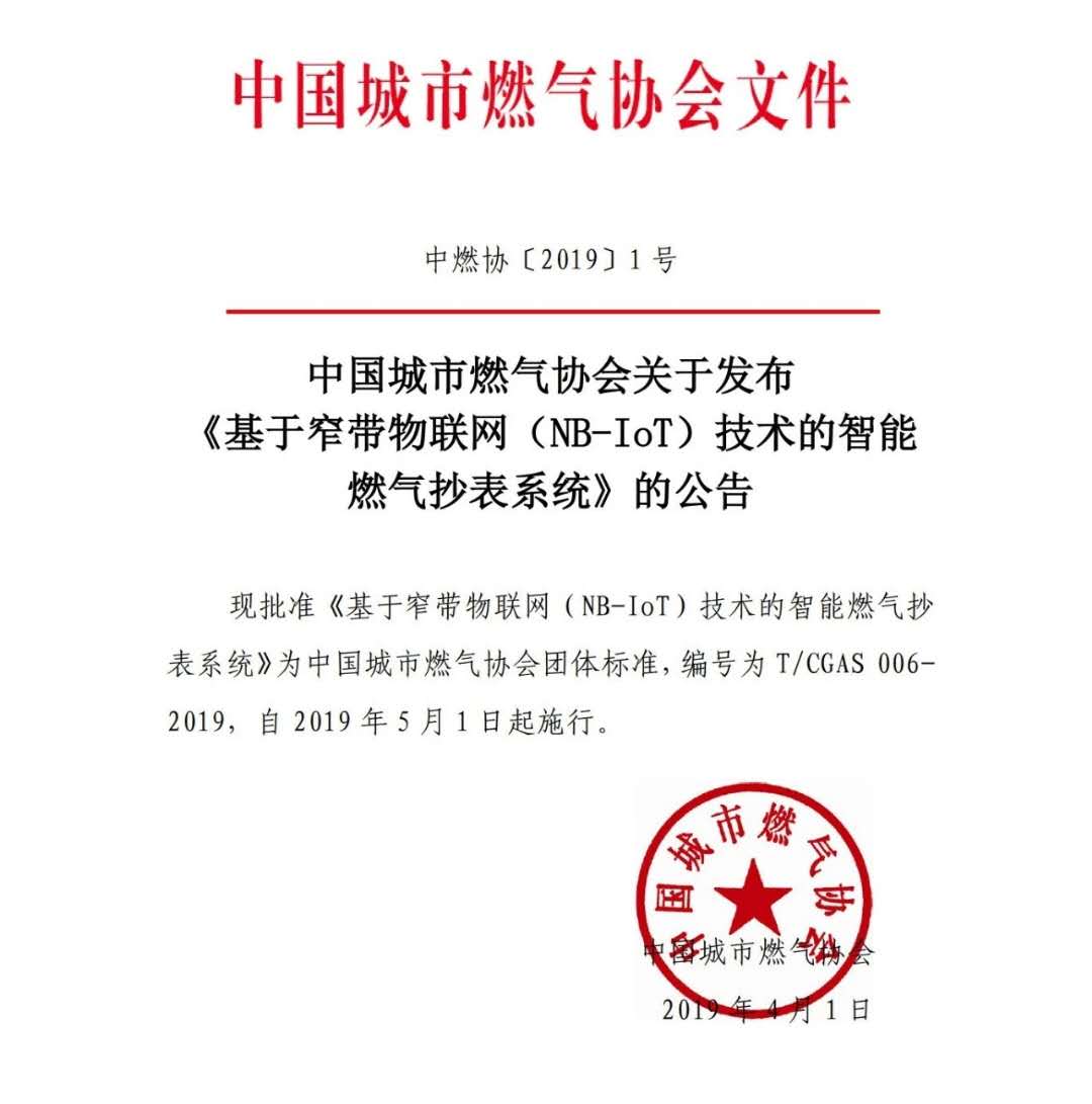 4月1日,T/CGAS 006-2019《基于窄帶物聯(lián)網(wǎng)(NB-IoT)技術(shù)的智能燃氣抄表系統(tǒng)》標準獲批發(fā)布, 2019年5月1日起正式施行。