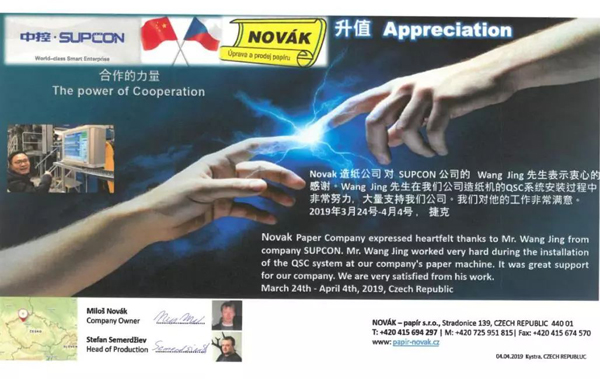 近日,中控海外團(tuán)隊(duì)收到了一封來(lái)自捷克Novak Paper的感謝信。在這背后,是一段雙方友好合作、中控竭心服務(wù)的故事。