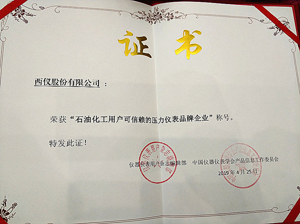 西儀股份榮獲“石油化工用戶可信賴的壓力儀表品牌企業