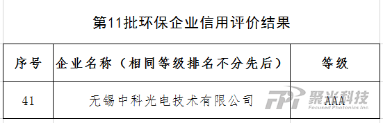 中科光電榮獲“AAA級環保信用企業”稱號