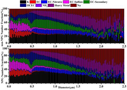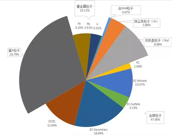 (2)含碳粒子,分為EC、EC-Nitrate、EC-Sulfate、EC-Secondary和OCEC,分別占總粒子的1.98%、10.07%、4.13%、18.84%和12.64%。