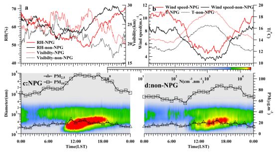 NPG和non-NPG天PM2.5濃度相差不大,分別為17.3和16.9μg·m-3;但是NPG天PM10和BC濃度較高,分別是non-NPG天的1.2倍和1.28倍。此外, NPG事件主要影響10-60nm數(shù)濃度分布和100-300nm表面積濃度分布。