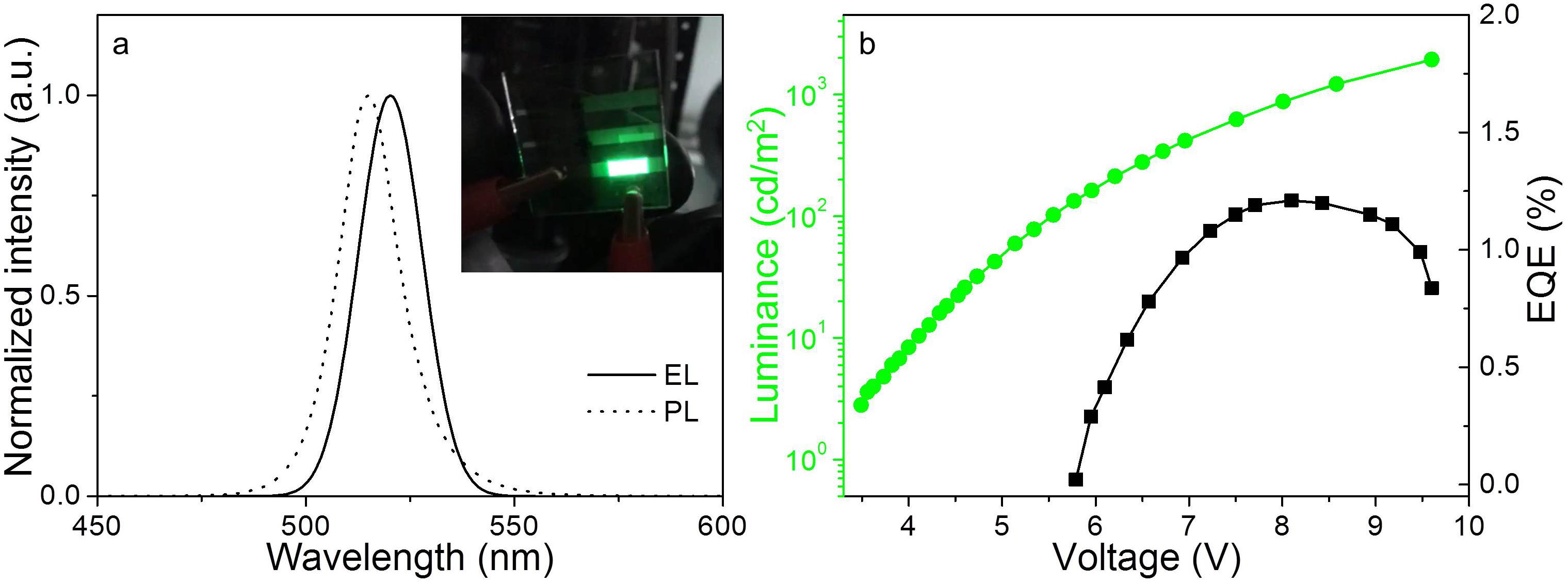(a)鈣鈦礦量子點做成LED器件前后的熒光發射光譜和器件照片結果