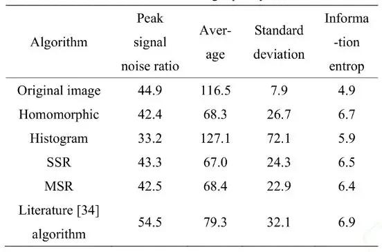 視網膜皮層(Retinex)圖像增強理論是根據人類視覺特征來展開研究的理論,其原理是通過去除圖像照射分量部分保留反射分量部分,從而獲得圖像本質特征,最早是在20世紀60年代,由學者Land等人提出。在其原有的基礎理論上,經過半世紀的發展,改進的Retinex算法被廣泛的運用于各領域。針對Retinex算法在處理圖像存在失真和耗時長等問題,Wang W.、LiB.等人提出了一種快速多尺度Retinex算法,以解決基于多尺度Retinex算法的圖像增強過程中顏色失真的問題,并改進了一種耗時較慢的圖像增強算法的缺點。但此算法在細節處的處理仍需完善,而Hanumantharaju等人提出了一種基于改進的multiscale Retinex(MSR)算法的新的彩色圖像增強技術,并使用小波能量來評估增強圖像的視覺質量。實驗結果證實了基于小波能量的MSR算法有效地表征了增強圖像的局部和全局細節。而針對Retinex算法在降噪方面的不足,又有學者提出基于Retinex和三維塊匹配(block matching 3D)的圖像增強方法。實驗結果證明,此算法既能很好地表征圖像中的細節,又有效地降低了圖像的噪聲,其結果與多種算法對比如表2所示。
