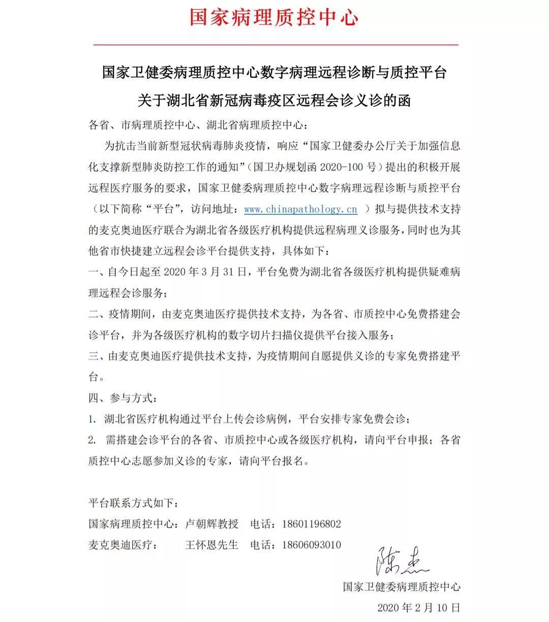 為抗擊當前新冠病毒感染的肺炎疫情,響應“國家衛健委辦公廳關于加強信息化支撐新型肺炎防控工作的通知”(國衛辦規劃函2020-100號)提出的積極開展遠程醫療服務的要求,支援湖北省抗擊新型冠狀病毒肺炎的疫情,國家衛健委病理質控中心數字病理遠程診斷與質控平臺(以下簡稱“平臺”,訪問地址:www.chinapathology.cn )擬與提供技術支持的麥克奧迪醫療聯合為湖北省各級醫療機構提供遠程病理義診服務,同時也為其他省市能快捷建立遠程會診平臺提供支持,具體如下: