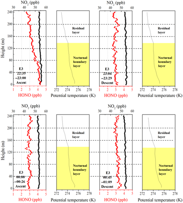 HONO作為OH自由基的重要前體物,其光解貢獻(xiàn)了日間25%–60%的OH自由基,在大氣光化學(xué)反應(yīng)過程中扮演著重要作用。盡管對(duì)大氣HONO的研究已有幾十年的歷史,其詳細(xì)的形成機(jī)理仍存在爭(zhēng)議,夜間地表面和氣溶膠表面的HONO生成仍是研究的熱點(diǎn)之一。因此,針對(duì)北京市高霧霾污染狀況,開展夜間HONO垂直梯度研究,研究不同污染階段夜間地表面和氣溶膠表面的HONO生成,對(duì)了解夜間大氣HONO生成機(jī)制具有重要意義。