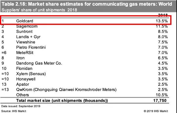 金卡智能已步入全球物聯網表計第一方陣。據HIS Markit統計,金卡智能燃氣終端全球市場占有率排名第一。