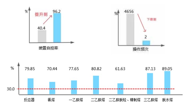 基于以上分析,中控技術(shù)結(jié)合乙胺裝置工藝特點(diǎn)和過程控制需求,采用多變量模型預(yù)測(cè)控制,結(jié)合專家控制等智能控制策略,實(shí)現(xiàn)乙胺裝置多目標(biāo)優(yōu)化和協(xié)同控制,提高裝置生產(chǎn)運(yùn)行的平穩(wěn)性,降低操作人員勞動(dòng)強(qiáng)度,為生產(chǎn)過程提供安全保障并通過“卡邊”優(yōu)化,降低能耗。