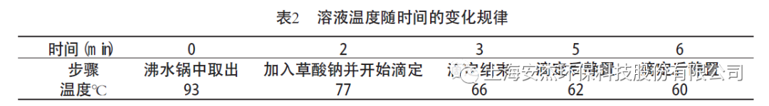 從沸水浴中取出錐形瓶時(shí)的溫度可達(dá)93℃,但加入草酸鈉溫度下降了16℃;滴定過程只用了1min, 溫度卻又下降了11℃,達(dá)到66℃。與反應(yīng)溫度下限只差6℃;滴定結(jié)束后在放置3min,溫度降至60℃。由此可見,滴定過程必須自加熱結(jié)束起快速進(jìn)行,爭取在3min 內(nèi)結(jié)束滴定,不能超過6 min。