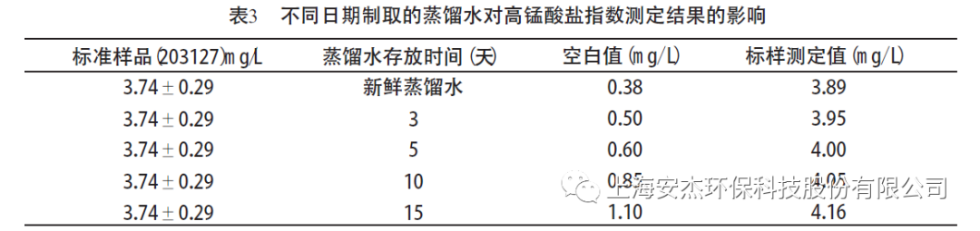 標(biāo)樣測定值隨著空白值的增大而增大,當(dāng)空白值為0.60 mg/ L (即蒸餾水存放時(shí)間為5 天)時(shí),測定結(jié)果已接近不確定度的上限,而空白值超過0.85 mg/ L (即蒸餾水存放時(shí)間超過10 天)時(shí),測定結(jié)果已超出不確定度的上限。因此,在測定高錳酸鹽指數(shù)時(shí),不要使用存放時(shí)間超過5 天的蒸餾水,最好取用新鮮蒸餾水,這樣就可以減少空白值對測定結(jié)果的影響。