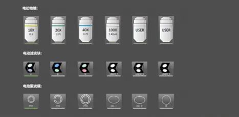 NCF950 提供多種電動(dòng)運(yùn)動(dòng)部件,包括:電動(dòng)平臺(tái)、電動(dòng)調(diào)焦、電動(dòng)物鏡轉(zhuǎn)盤、電動(dòng)熒光轉(zhuǎn)盤、電動(dòng)聚光鏡和電動(dòng)調(diào)光,操作方式同時(shí)兼容按鈕操作和軟件操作,并且提供調(diào)用命令,方便用戶自行控制和開發(fā)。