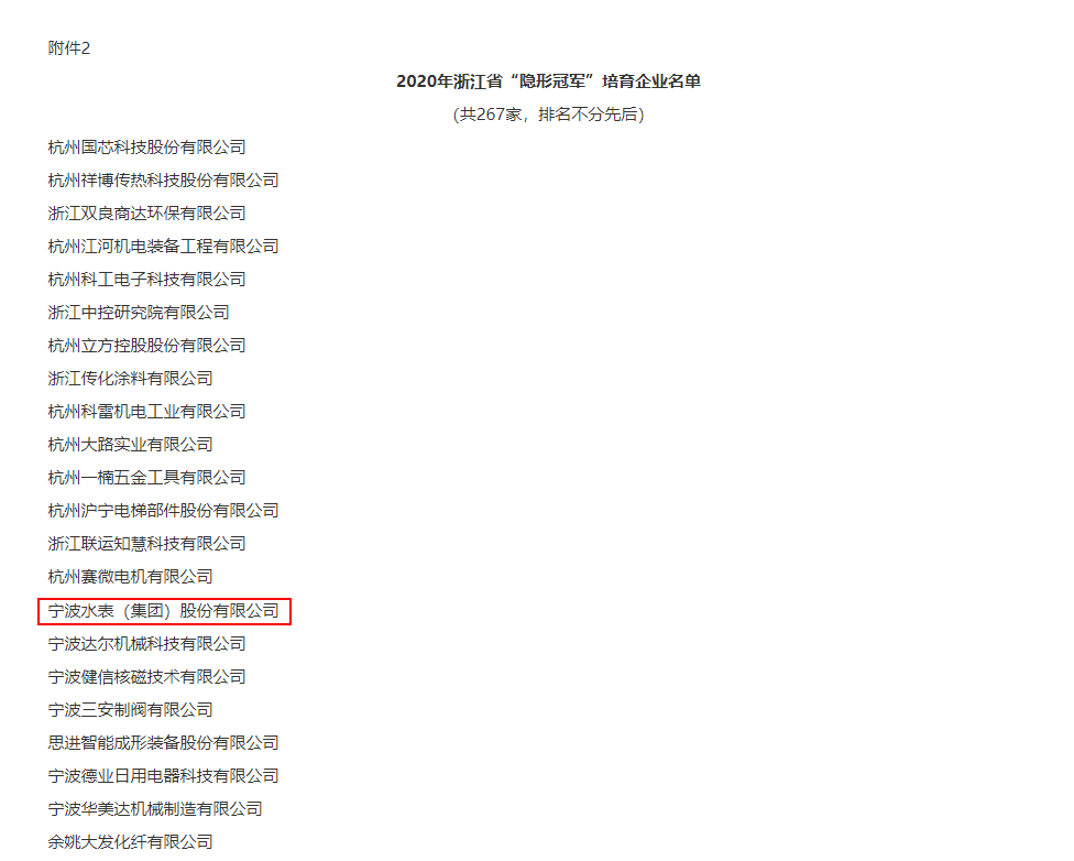 2021年1月13日,浙江省經(jīng)濟(jì)和信息化廳公布“浙江省隱形冠軍”企業(yè),寧水集團(tuán)成功入選培育名單。