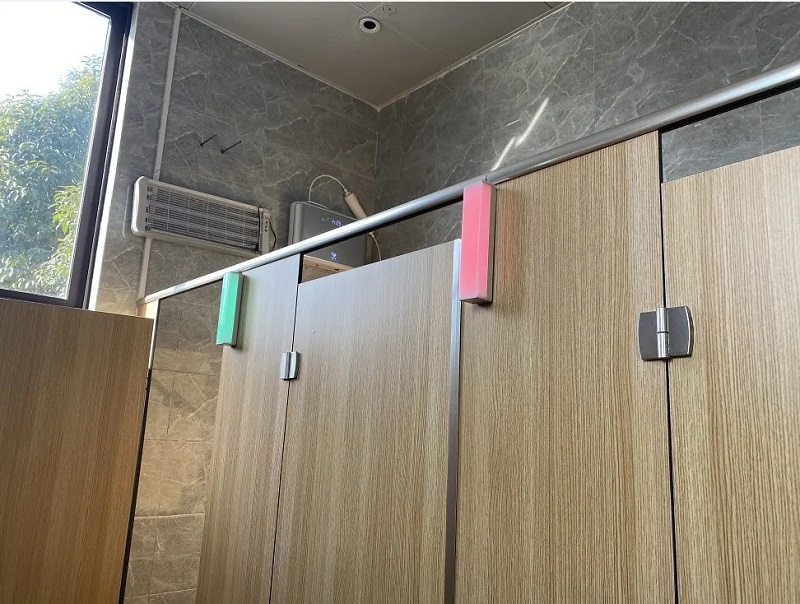 3.快速找空位:傳統(tǒng)公廁進(jìn)入后,有時(shí)很難確定廁位是否有人,隔間門(mén)口的紅綠色標(biāo)志不清晰,總要挨個(gè)拉開(kāi)來(lái)判斷。有了智慧公廁,這一問(wèn)題便可以完美解決。每個(gè)廁位隔間上方都安裝了一個(gè)紅外傳感設(shè)備,當(dāng)使用者進(jìn)入后將門(mén)反鎖,廁位門(mén)上的燈柱便會(huì)自動(dòng)由綠色轉(zhuǎn)為紅色,顯示該廁位“有人”,使廁所使用情況一目了然。
