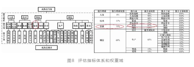 經過分析后發現,在國標的評價體系中,智能裝備和智能生產這兩大智能制造的支柱在指標的數量和比重上有著失衡。和智能裝備直接相關的指標只有一個域——裝備。這是12個能力域中的一項,而其評分的比重僅占10%,如圖8所示。