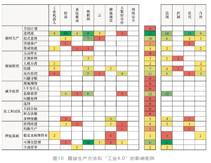 從這里可以看出,我國制造業企業的運轉效率整體上仍處于較低水平。因此,我國企業在試圖通過智能制造技術實現發展的彎道超車之時,通過挖掘內部潛力,提升質量、效率和效益仍然是急需補上的短板。所以,在實施智能制造的同時,采用精益生產模式改善內部運營的質量效益水平是可行之道。實際上,精益生產模式被世界制造業發達國家廣泛采用已經有近20年的歷史,它的方法和工具與智能制造的技術手段有著互相促進的作用。國際生產研究雜志(International Journal of Production Research)曾發表一篇論文,將精益生產的方法和工具與“工業4.0”的方法和工具進行比較研究,對他們的影響因素進行統計,如圖10所示。