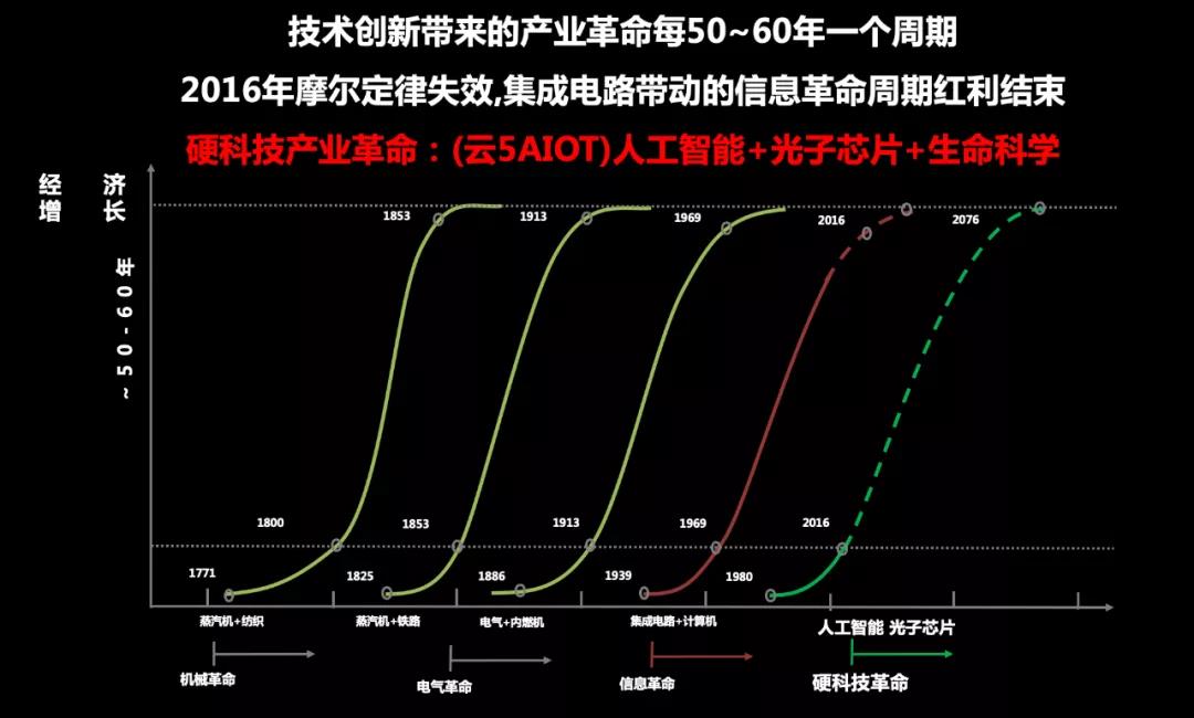 為什么會有這個輪回?我認為本質是因為科技創新的周期和一次大型工業革命的周期大概就是50-60年。無論是從第一次蒸汽機的革命,還是現在的集成電路革命都是60年左右,上一次的以集成電路推動信息革命到現在基本上已經60年左右。