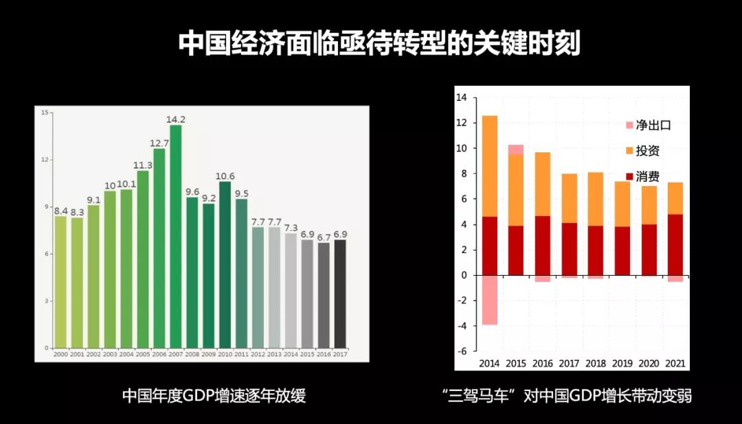 從中國發展的規律來看,中國GDP從2008年之后逐年放緩,本質是中國過去40年的高增長來自于發達國家前三次科技革命的技術紅利的擴散。我們用40年的時間借助中國龐大的人口紅利,借助歐美國家產業升級,然后把中低端的制造業進行剝離,完成了一次工業革命的起飛和積累。