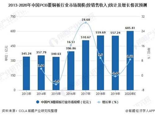 2013-2020年中國PCB覆銅板行業市場規模(按銷售收入)統計及增長情況預測