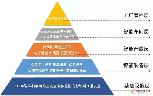 智能工廠可以分為基礎設施層、智能裝備層、智能產(chǎn)線層、智能車間層和工廠管控層五個層級: