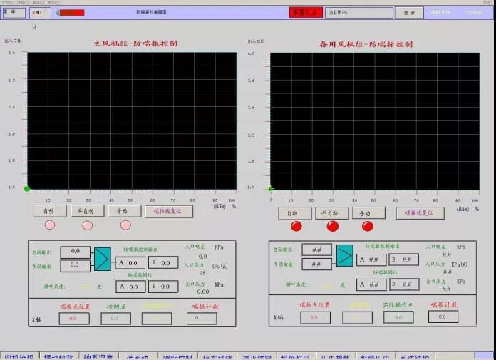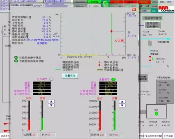通過主風(fēng)機組出口壓力及出口流量自動控制靜葉及防喘振閥的控制方案,實現(xiàn)兩個控制回路之間的解耦。在此項目之前國內(nèi)沒有項目成功投用主風(fēng)量與壓力全自動控制軸流式主風(fēng)機組靜葉和防喘閥。可以選擇流量優(yōu)先或壓力優(yōu)先兩種自動控制模式,實現(xiàn)了主風(fēng)機的最佳工作工況和穩(wěn)定運行。