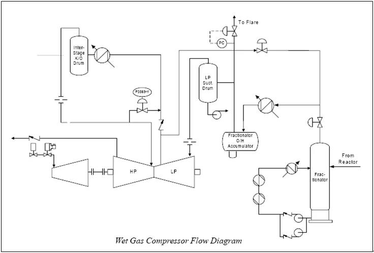 由分餾塔頂油氣分離器來的富氣,經(jīng)富氣壓縮機(“氣壓機”習(xí)慣叫法)入口前的文丘利管及入口閘閥進入氣壓機的第一段壓縮,壓縮后的氣體進入中間氣體冷卻器,富氣經(jīng)冷卻器冷至40度后,進入氣壓機的氣液分離器進行氣液分離。分液后的氣體進入氣壓機二段壓縮,然后出口進入吸收穩(wěn)定部分。氣壓機中間分液罐分離出的凝縮液則由凝縮液泵送入吸收穩(wěn)定部分,小型裝置可返回分餾部分。有的裝置在壓縮機入口設(shè)有氣液分離罐,并配有相應(yīng)的凝液排出系統(tǒng)。考慮到緊急狀態(tài),設(shè)有富氣放火炬系統(tǒng),由放火炬線上風(fēng)動蝶閥或風(fēng)動閘閥控制。為在機組事故緊急停機時能及時將入口卸壓,在停機信號發(fā)出時,入口放火炬閥連鎖自動打開。為了防止機組喘振,采用二段防喘振回路控制,來控制防喘振調(diào)節(jié)閥開度,以保證操作點不進入喘振區(qū),保持壓縮機運行的穩(wěn)定。
