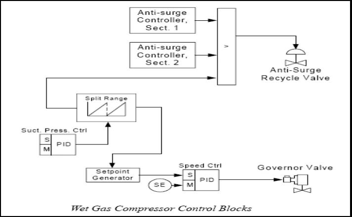 根據(jù)工藝要求,富氣壓縮機通常有出口保持恒壓的要求,正常運轉(zhuǎn)時,通過升高或降低汽輪機的轉(zhuǎn)速從而保持壓力的穩(wěn)定。在機組有喘振發(fā)生時,性能控制于喘振控制需要采取聯(lián)偶的方式控制運行。