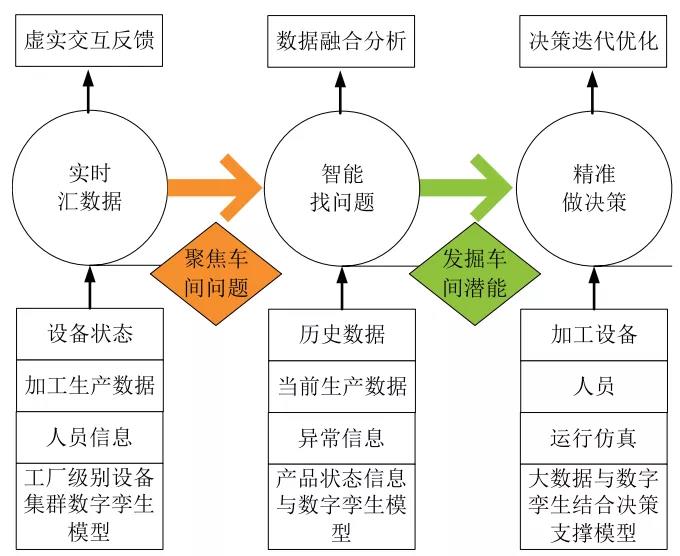 其理念如圖5所示,首先,通過設備狀態、工廠級別設備集群數字孿生模型等將數據實時匯聚起來,實現虛實交匯反饋;然后聚焦車間問題,明晰解決機制,發現問題分析原因快速決策。然后,基于歷史數據、產品狀態信息與數字孿生模型等,利用人工智能算法完成查找問題方案,實現數據融合分析;進而發掘車間潛能,實現優化迭代,找到優化方向逐步提升效果。最后,利用加工設備、大數據與數字孿生結合決策支撐模型,對管控平臺精準決策,并對決策迭代持續優化。