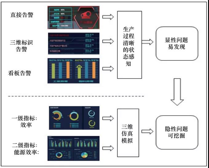 智能找問題在管控平臺主要分為顯性問題發現和隱性問題挖掘。顯性問題發現可通過生產過程清晰的狀態感知,包括:車間生產過程中的設備工況、生產節拍、過程實況、物料信息、人員操作、能耗變化、產品質量和安全環境等狀態的實時感知。隱性問題挖掘基于三維仿真模擬,主要基于數字孿生的智能車間通過應用大數據及生產系統模型,建立的多級指標連接響應機制可以及時模擬生產情況,借助虛實對照,實現流程差異反饋和歷史環節追溯。如圖7所示。