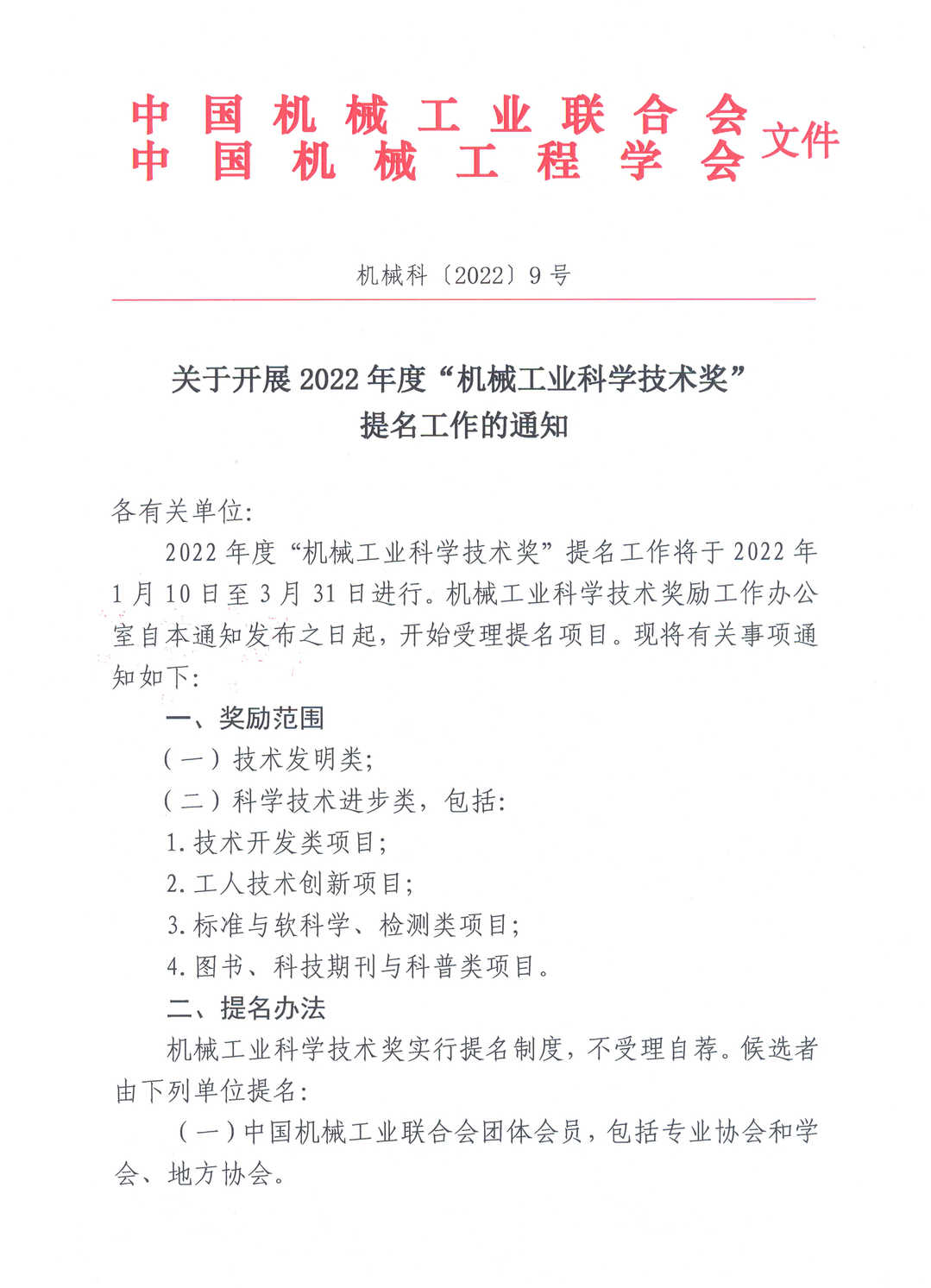 關于開展2022年度“機械工業科學技術獎”提名工作