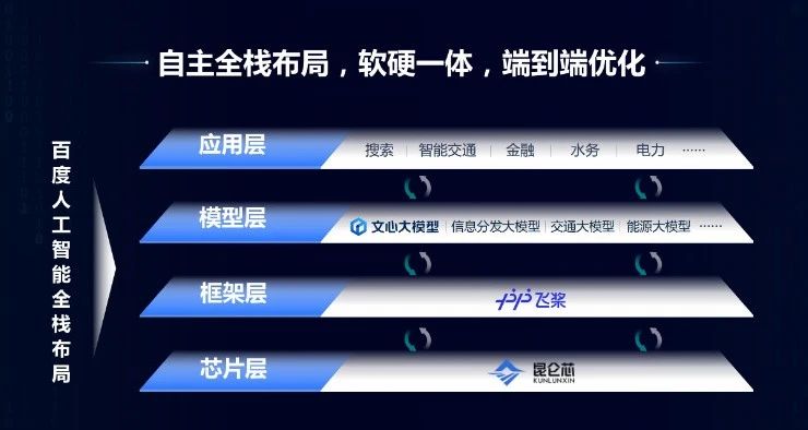 這方面百度有比較明顯的優勢,我們在四層當中每一層都有比較領先的產品,比如說芯片層有昆侖芯。這個也做了有十年之久,最早是因為搜索應用需要,我們買別人的芯片,畢竟太貴了,所以自己開發了??蚣軐邮秋w槳,飛槳今天在中國的市場份額第一。在模型層是文心大模型,其實除了文心一言,它是對標ChatGPT的之外,我們還有很多行業大模型,如交通大模型、能源大模型等。應用層的話,像百度搜索等都是我們比較領先的應用。