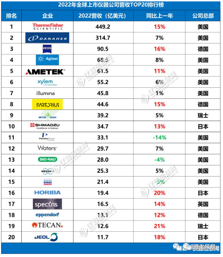 2022年全球Top20的儀器廠家之中,美國有11家,日本,德國各3家,瑞士2家,英國1家,沒有一家企業(yè)出自中國,而在前十家名單之中,有6家企業(yè)來自美國。
