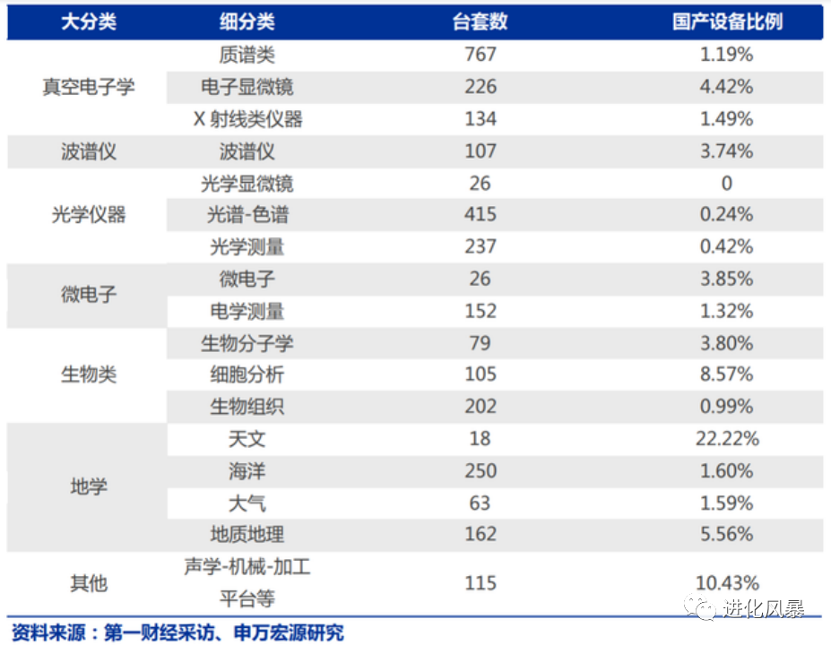 2016-2019 年間,中科院下屬研究所采購的200萬以上的科學(xué)儀器中,國產(chǎn)質(zhì)譜儀、X 射線類儀器、光學(xué)色譜儀、光學(xué)顯微鏡比例不足 1.5%,其中,光學(xué)顯微鏡國產(chǎn)采購率為0。類似核磁共振波譜儀、液質(zhì)聯(lián)用儀、X射線衍射儀的“國貨”占比率,僅為0.99%、1.19%、1.32%。