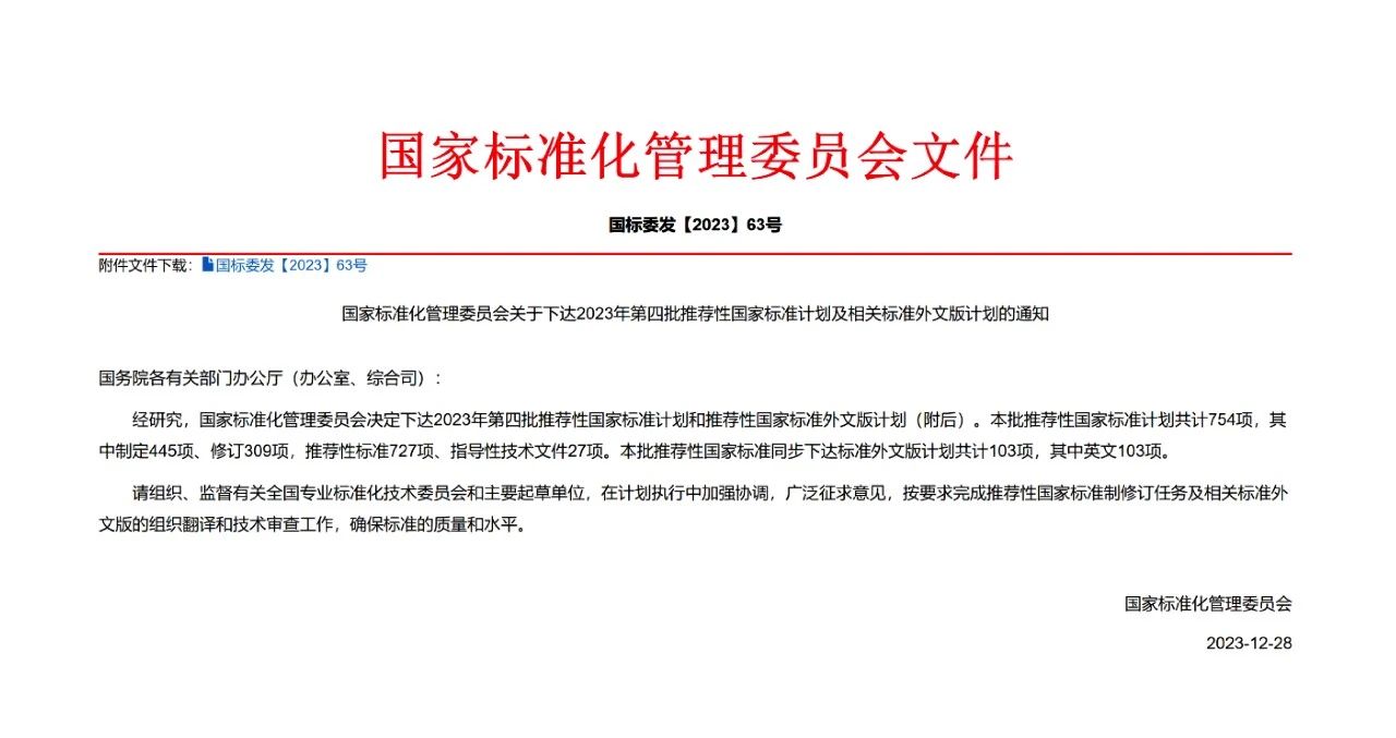 2023年12月28日,國家標準化管理委員會決定下達2023年第四批推薦性國家標準計劃和推薦性國家標準外文版計劃。
