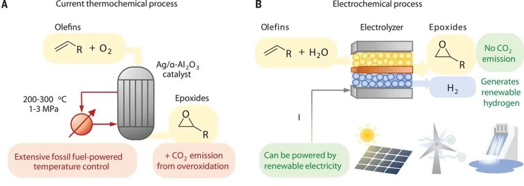加拿大多倫多大學(xué)Edward H. Sargent院士課題組采用電化學(xué)合成法,借助氧化還原介質(zhì)氯離子,在常溫常壓下達成電極和乙烯之間的電子交換,將乙烯成功轉(zhuǎn)化為環(huán)氧乙烷和環(huán)氧丙烷(圖B)。相對于傳統(tǒng)熱合成環(huán)氧乙烷/環(huán)氧丙烷的嚴苛條件,如高溫高壓(200-300°C,1~3Mpa),Ag催化乙烯完成環(huán)氧乙烷的合成(圖A),且生產(chǎn)1噸的環(huán)氧乙烷就會同時排放0.9噸的CO2, 文中采用綠色電化學(xué)方法實現(xiàn)了零碳排、更溫和和更具選擇性的環(huán)氧乙烷/環(huán)氧丙烷的合成,有望代替苛刻的熱合成法,實現(xiàn)工業(yè)化,文章發(fā)表在Science上[2]。