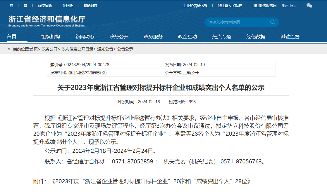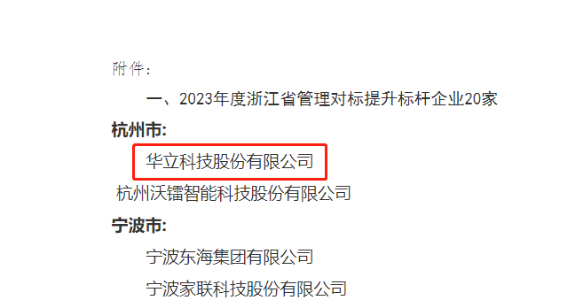 近日,浙江省經信廳公布了“2023年度浙江省管理對標提升標桿企業名單”,全省共有20家企業入選。其中,華立科技成功躋身杭州市兩家入選企業之一,獲評“2023年度浙江省管理對標提升標桿企業“稱號。